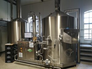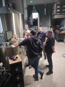 Nachdem Wendelin mir eine kurze Nachricht hat zukommen lassen, dass die Anlage trotz des automatischen Starts in der Nacht noch nicht so weit ist wie geplant, treffen wir uns entspannt um 10:00 Uhr in den heiligen Hallen des Sudhauses. Wendelin wartet vor der Brauanlage auf uns und kontrolliert die Einstellungen „die Vorderwürzehopfung konnte ich dank der Verzögerung doch noch realisieren“ verkündet er. Ein technisches Detail über dass sich die Rezept-Experten im Vorfeld ausgelassen hatten, die sehr frühe Hopfengabe, welche maßgeblich für die Bittere und Haltbarkeit des Bieres verantwortlich ist. Wird der Hopfen bereits in die – vergleichsweise – kühle Vorderwürze gegeben, soll die Bittere im fertigen Bier nicht so nachhängen, was wiederum für eine bessere „drinkability“ sorgt. Wir sind gute zwei Stunden hinter dem Zeitplan, aber ansonsten läuft alles wie es soll.