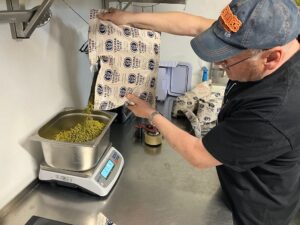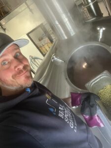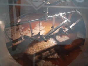 Während die Würze weiter aufgeheizt und wird, um Sie für ca. 60 Minuten zu Kochen, ist wieder Muskelkraft gefragt: der ausgelaugte Treber muss aus der Anlage entfernt und der Läuterbottich gereinigt werden – nicht umsonst heißt es, dass 50% des Brauprozesses aus Putzen besteht, da ist was dran! Wie der erfahrene Hobbybrauer weiß, dient das Kochen der Würze dem Austreiben unliebsamer Stoffe aus der Würze, die ansonsten zu Fehlaromen im fertigen Bier führen können, zum Haltbarmachen und Sterilisieren, sowie zum Einbinden des Hopfens. Die Bitterstoffe, welche zur Haltbarkeit des Bieres beitragen, die sogenannte Alphasäure, Isomerisieren oberhalb 80 °C und werden dadurch erst richtig wasserlöslich. Späte Hopfengaben zum Ende der Kochzeit hingegen sorgen für ein spannendes Aroma- und Geschmacksprofil des Bieres – so auch für dieses Bier unerlässlich.