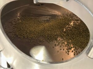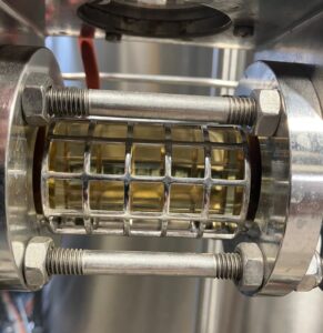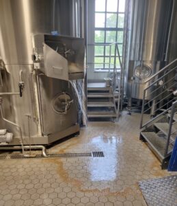 Nach dem Kochen wird die Würze zunächst in den „Whirlpool“ gepumpt – ein Behälter in dem die Würze zusätzlich in einen Strudel versetzt wird, bei dem sich Trubstoffe wie ausgefälltes Eiweiß und Hopfenreste in der Mitte des Behälters in einem Trubkegel absetzen. Um die Würze hierfür zügig nahe an 80°C zu bringen, wurde eine Teilmenge kaltes Wasser vorgelegt. Unser Bier bekommt an dieser Stelle auch eine zusätzliche Whirlpoolhopfung, die als Hopfenpellets ebenso wie das Wasser im Whirlpool vorgelegt wurden. Durch die niedrigere Temperatur werden in diesem Schritt nur sehr wenige Bitterstoffe gelöst. Stattdessen wird die Würze mit den aromatischen Ölen und Polyphenole aus dem Hopfen angereichert, was dem Bier eine intensiv fruchtige Note verleihen soll.