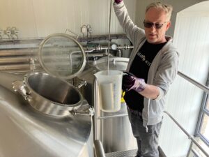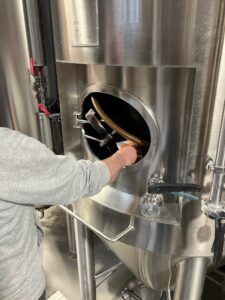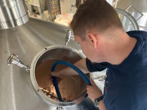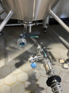 Die fertige Würze wird im letzten Schritt durch den Plattenwürzekühler direkt auf die geplante Anstelltemperatur von 14°C gebracht und beim Weiterpumpen in den Gärtank bereits belüftet, um der Hefe die richtigen Voraussetzungen für ein zügiges „Ankommen“ zu schaffen. Die Hefe (in diesem Fall Trockenhefe) wurde bereits vorm Befüllen im Gärtank vorgelegt.