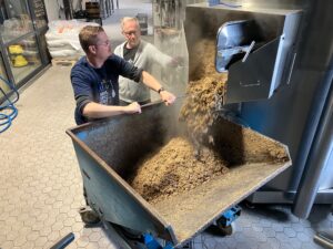 Die Größe der Anlage unterscheidet sich natürlich deutlich von dem, was wir als „Hobbybrauer“ sonst gewohnt sind. Für 15 Hektoliter ist diese Anlage ausgelegt. Ein Qualitätsprodukt der Firma Kaspar Schulz aus Bamberg – der Mercedes unter den Brauanlagenherstellern. Ein feuchter Traum für uns, die normalerweise zuhause in der Größenordnung um die 20 Liter je Sud brauen. Der Blick in die Maischepfanne zeigt jedoch das vertraute Bild goldbrauner Maische. Die verschiedenen Enzyme des gemälzten Getreides haben in der Nacht die Stärke der Malzkörner in Zucker umgewandelt. Der Flüssige Teil dieser Suspension – die Würze – wird nun von den festen Bestandteilen – dem Treber – getrennt. Um keinen Malzextrakt zu verschwenden, wird währenddessen 3-mal mit Nachgußwasser „angeschwänzt“, um jeglichen Restzucker auszuspülen der sich noch im Treber befindet.