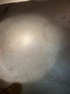 Das Läutern erfolgt nach Umpumpen im zweiten Kessel mit einem klassischen Läuterboden. Mit einer Läuterruhe, und dem üblichen Bierchen zur Verkürzung der Wartezeit, kam die schöne Vorderwürze zum Vorschein. Tolle Farbe – so wie geplant! Mit kontinuierlichem Nachguss und einmaligem Aufhacken wurde eine gute Extraktmenge erreicht, die tendenziell Spielraum zum Verdünnen anzeigte. Nun wurden noch Hopfengaben vorbereitet und die Pfanne zum Kochen hochgeheizt.