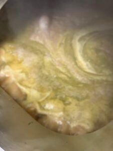 Das Läutern erfolgt nach Umpumpen im zweiten Kessel mit einem klassischen Läuterboden. Mit einer Läuterruhe, und dem üblichen Bierchen zur Verkürzung der Wartezeit, kam die schöne Vorderwürze zum Vorschein. Tolle Farbe – so wie geplant! Mit kontinuierlichem Nachguss und einmaligem Aufhacken wurde eine gute Extraktmenge erreicht, die tendenziell Spielraum zum Verdünnen anzeigte. Nun wurden noch Hopfengaben vorbereitet und die Pfanne zum Kochen hochgeheizt.