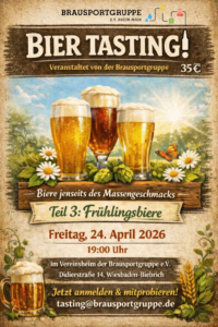 Im dritten Teil unserer Reihe „Biere jenseits des Massengeschmacks“ am 24.04.2026 werdet ihr wieder 6 unterschiedliche Biere verkosten, die diesmal passend zur Jahreszeit den Fokus „Frühlingsbiere“ haben. Weiterhin bekommt ihr noch viele Informationen rund um den Brauprozess, Sensorik und die Geschichte der verkosteten Biere vermittelt.
